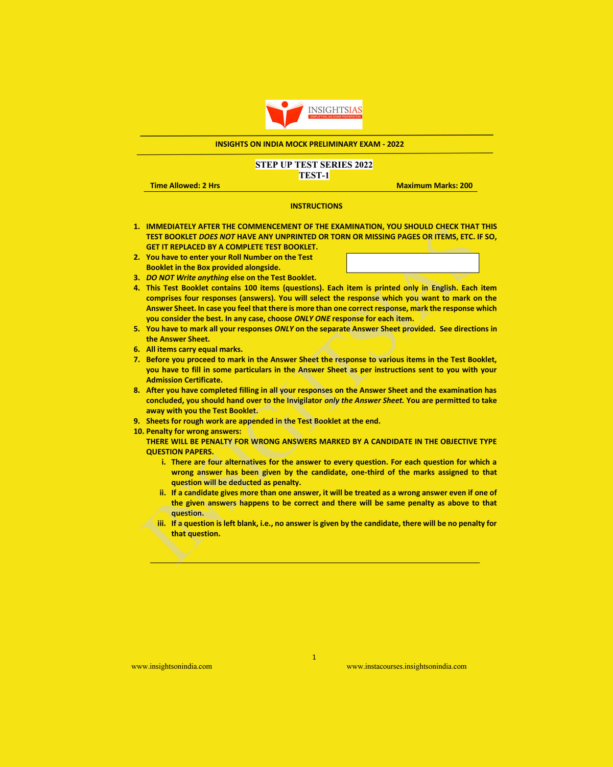 / INSIGHTS ONINDIA 2022 STEP UP TEST SERIES 2022 TEST-1 (BLACK & WHITE)