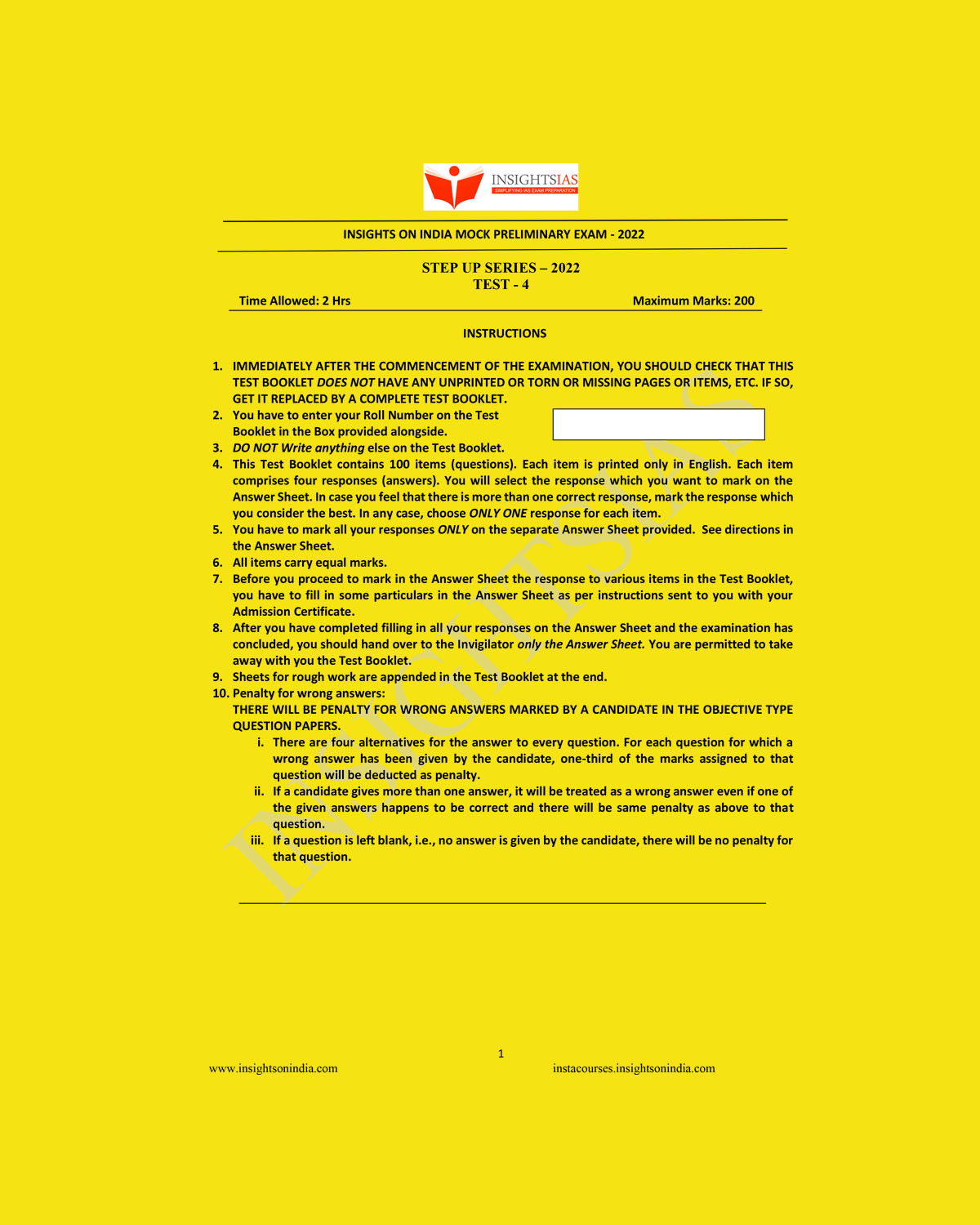 / INSIGHTS ONINDIA 2022 STEP UP TEST SERIES 2022 TEST-4 (BLACK & WHITE)