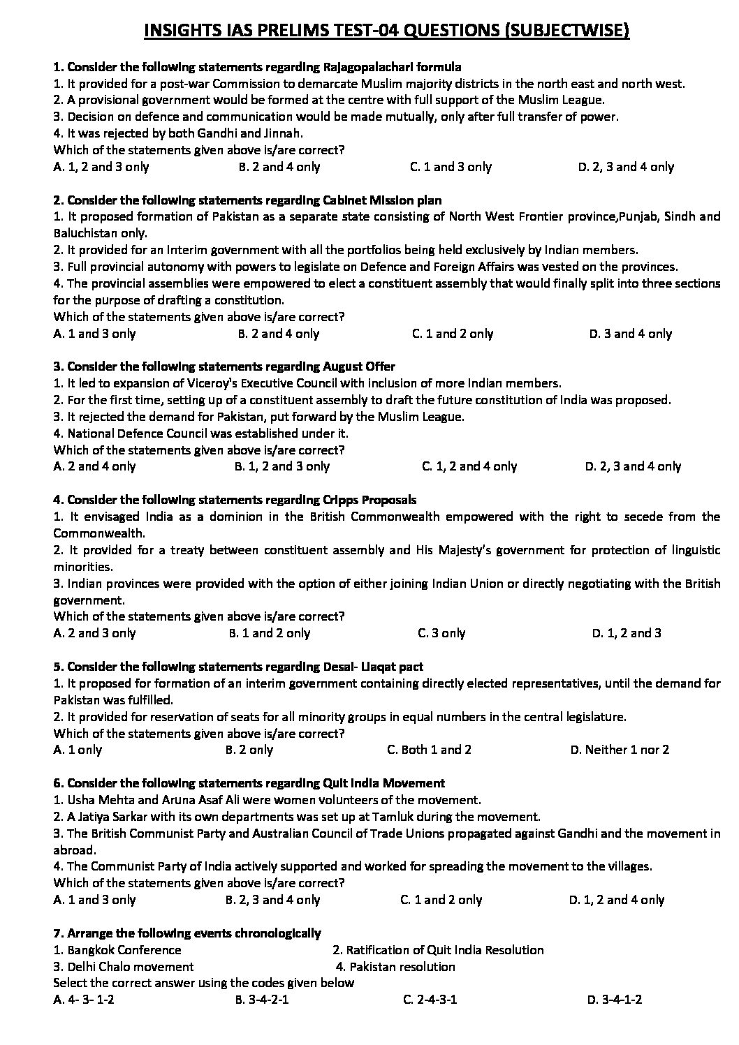 / INSIGHTS ONINDIA 2024 SUBJECT WISE PT TEST-04 (MODERN INDIA) ENGLISH MEDIUM 2024 (BLACK & WHITE)