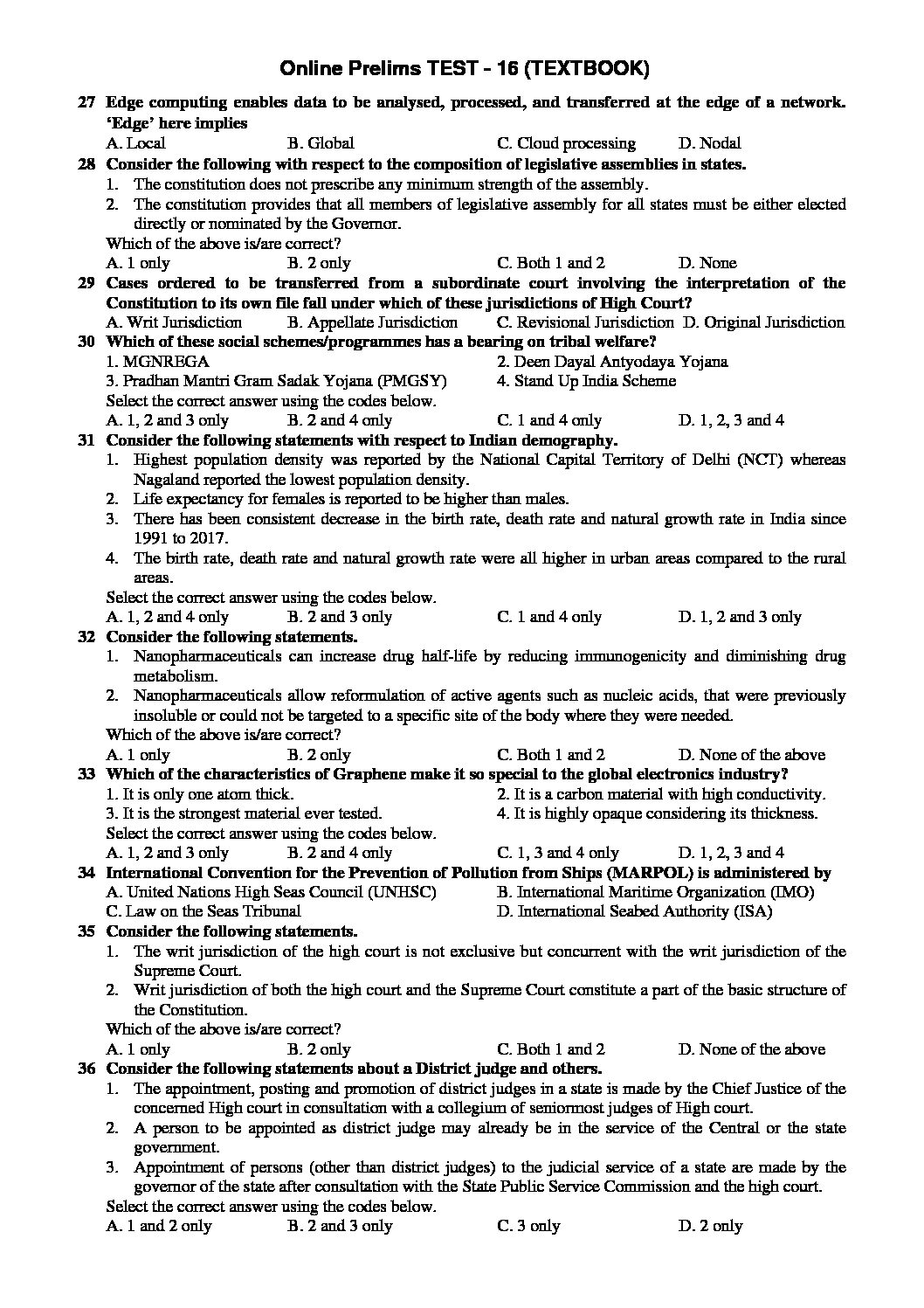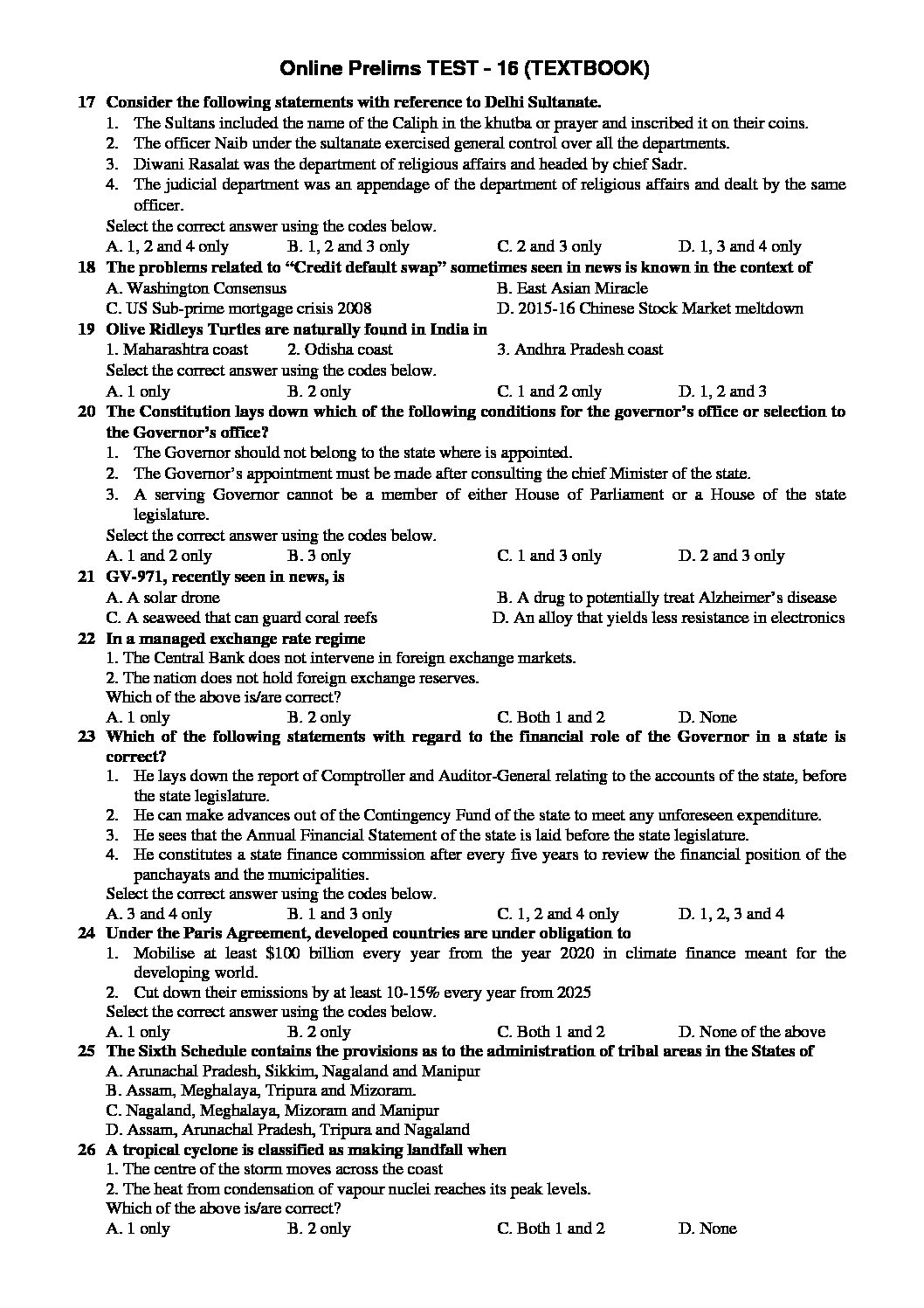 INSIGHTS PT TEST-16 ( POLITICAL, ECONOMY, HISTORY & CURRENT AFFAIRS) (TEXTBOOK APPROACH 2020) (BLACK & WHITE)