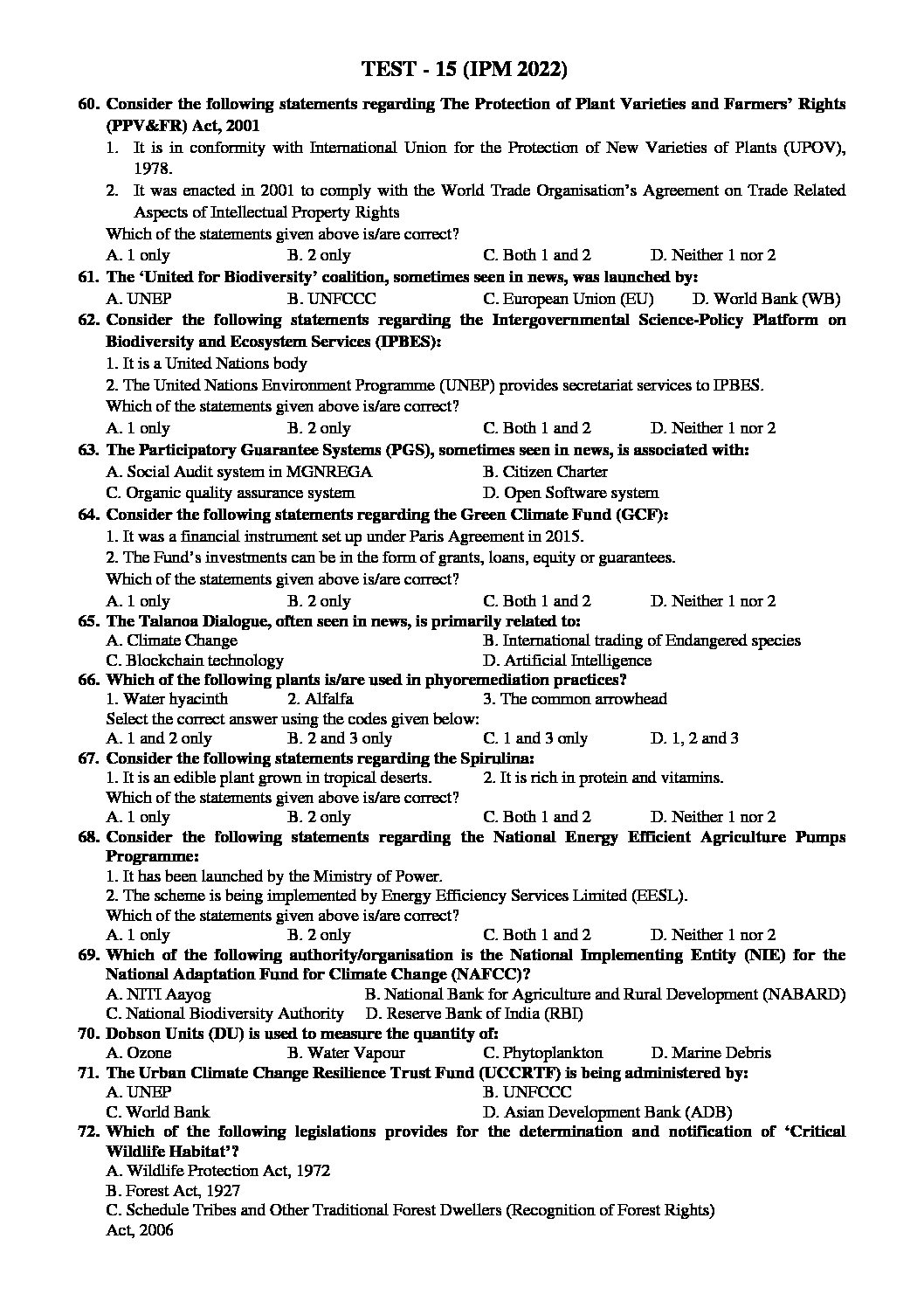 INSIGHTS ONINDIA 2022 PT TEST-15 WITH SOLUTION (ECOLOGY & ENVIRONMENT )(SUBJECTWISE APPORACH) 2022(BLACK & WHITE)