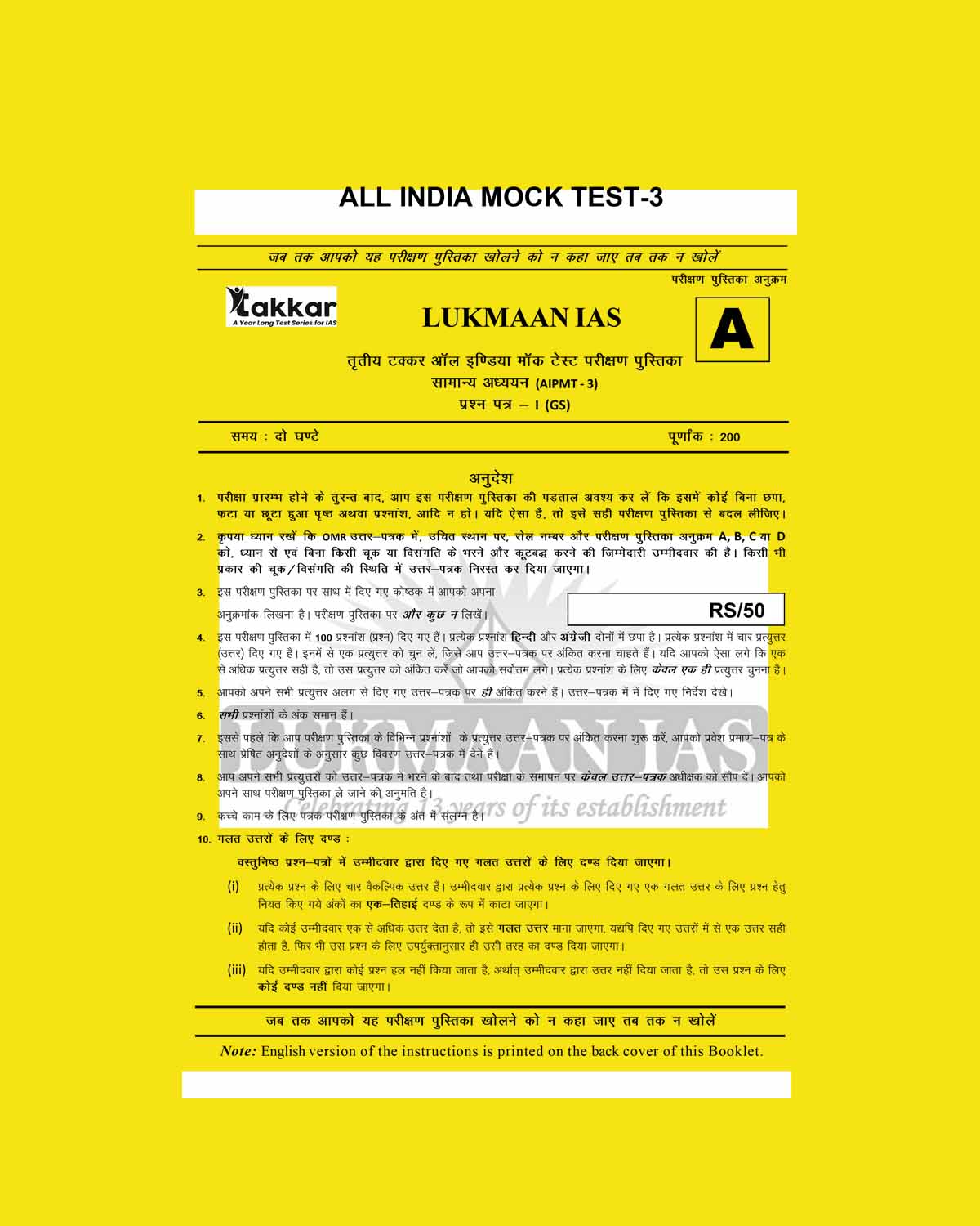 LUKMAAN IAS 2024 ALL INDIA MOCK TEST-3 2024 FINAL {ENGLISH} {BLACK AND WHITE} quantity