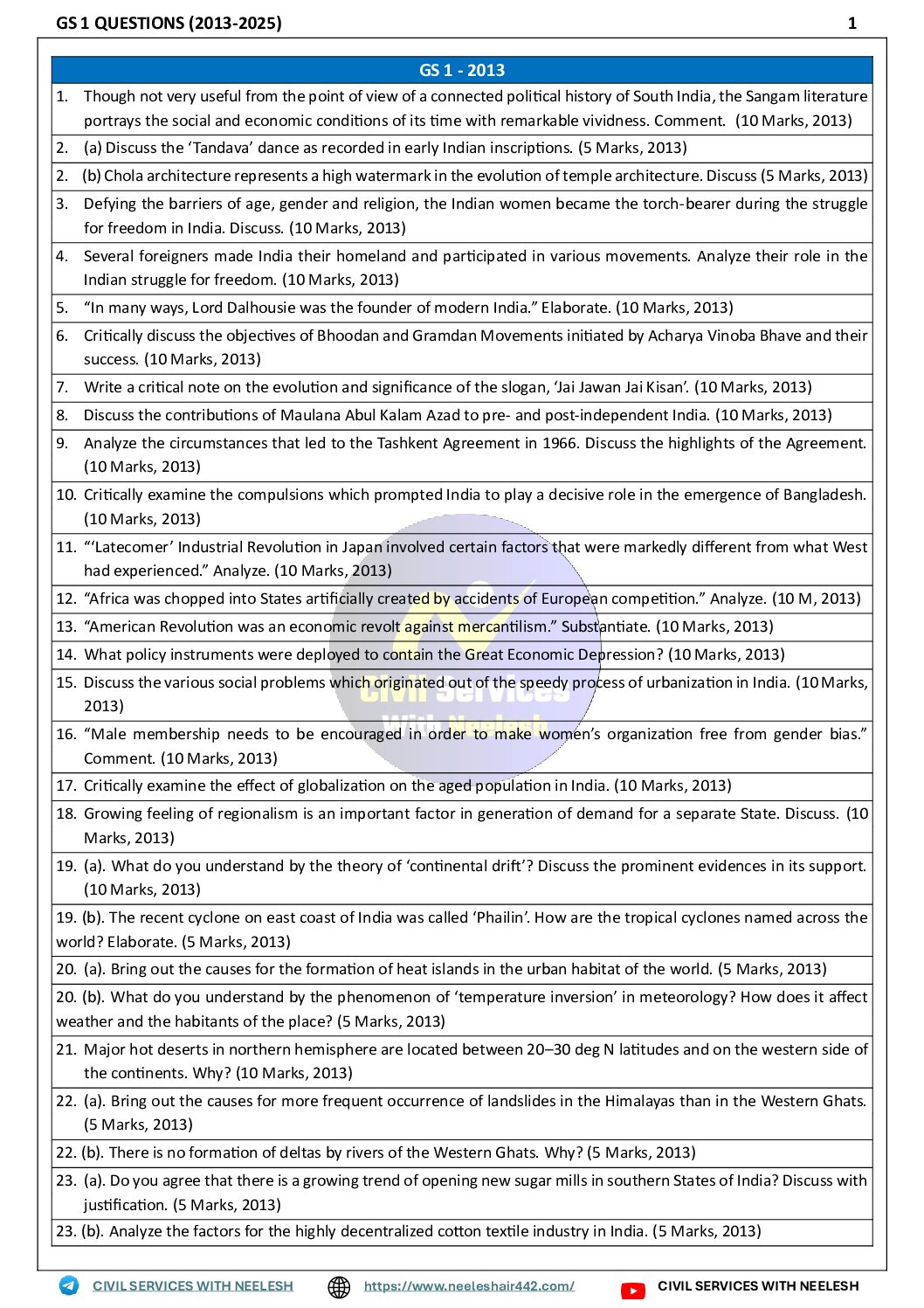 NEELESH KUMAR MAINS PYQ 2025 GS 1 (2013 TO 25) FINAL SOLVED(YEARWISE) (ENGLISH) {BLACK AND WHITE}