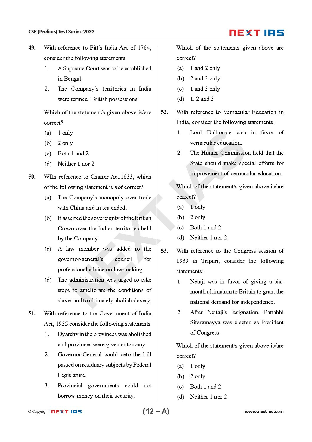 NEXTIAS 2022 TEST-9 (TEST CODE-221009) GENERAL STUDIES CSE (P) TEST SERIES 2022 SUBJECT- MODERN HISTORY OF INDIA GEOGRAPHY, REVISION OF TEST-8, CURRENT AFFAIRS (BLACK & WHITE)