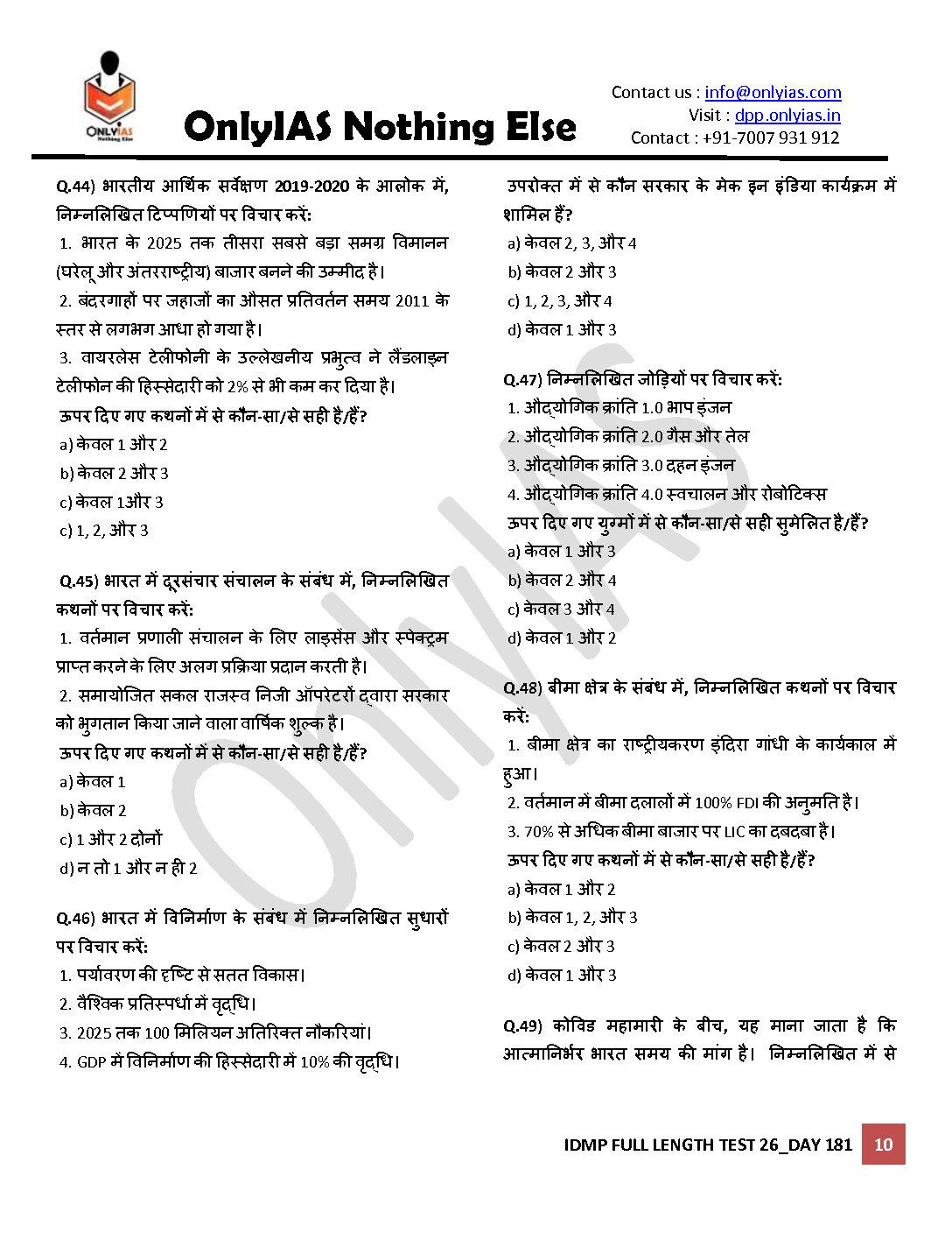 / ONLY IAS HINDI 2022 IDMP TEST-26 (अर्थशास्त्र) HINDI MEDIUM –(BLACK & WHITE)
