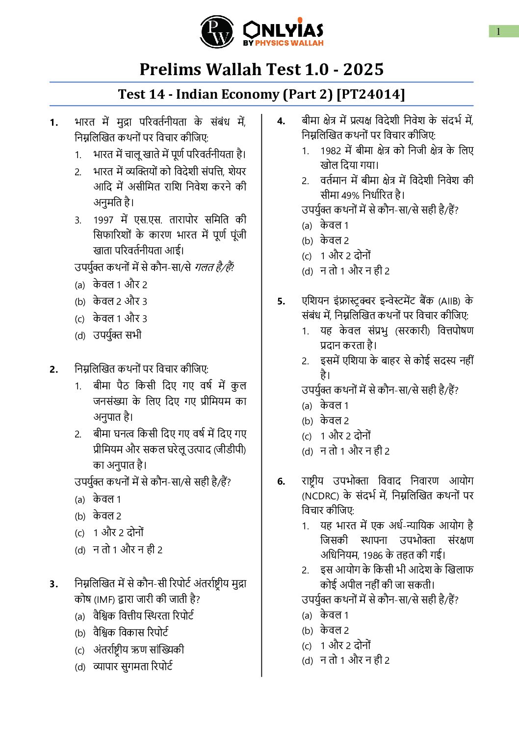 ONLY IAS HINDI 2025 TEST-14 INDIAN ECONOMY PART-2 2025 FINAL (HINDI) {BLACK AND WHITE}