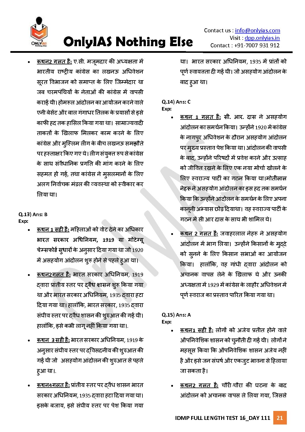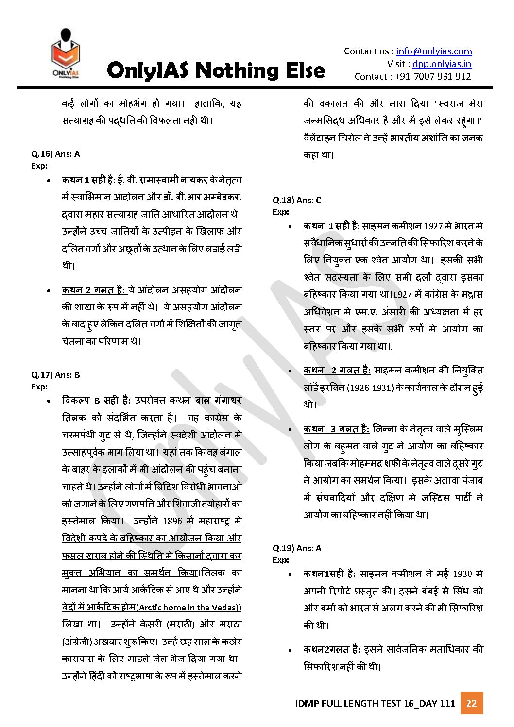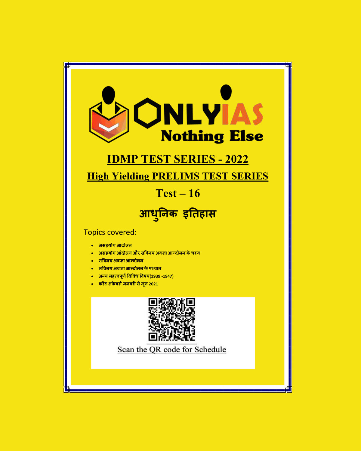 ONLYIAS 2022 IDMP TEST SERIES -2022-HIGH YIELDING PRELIMS TEST SERIES TEST-16 (आधुनिकइतिहास) HINDI MEDIUM (BLACK & WHITE)