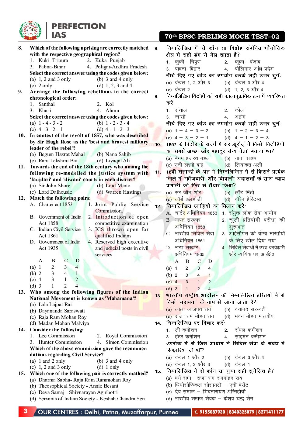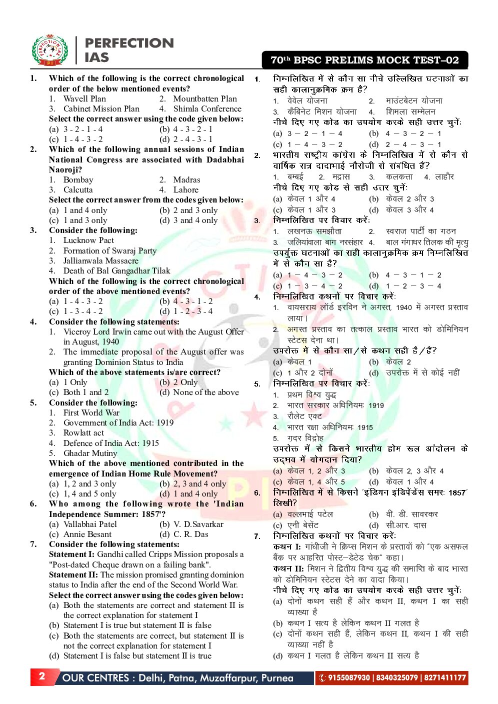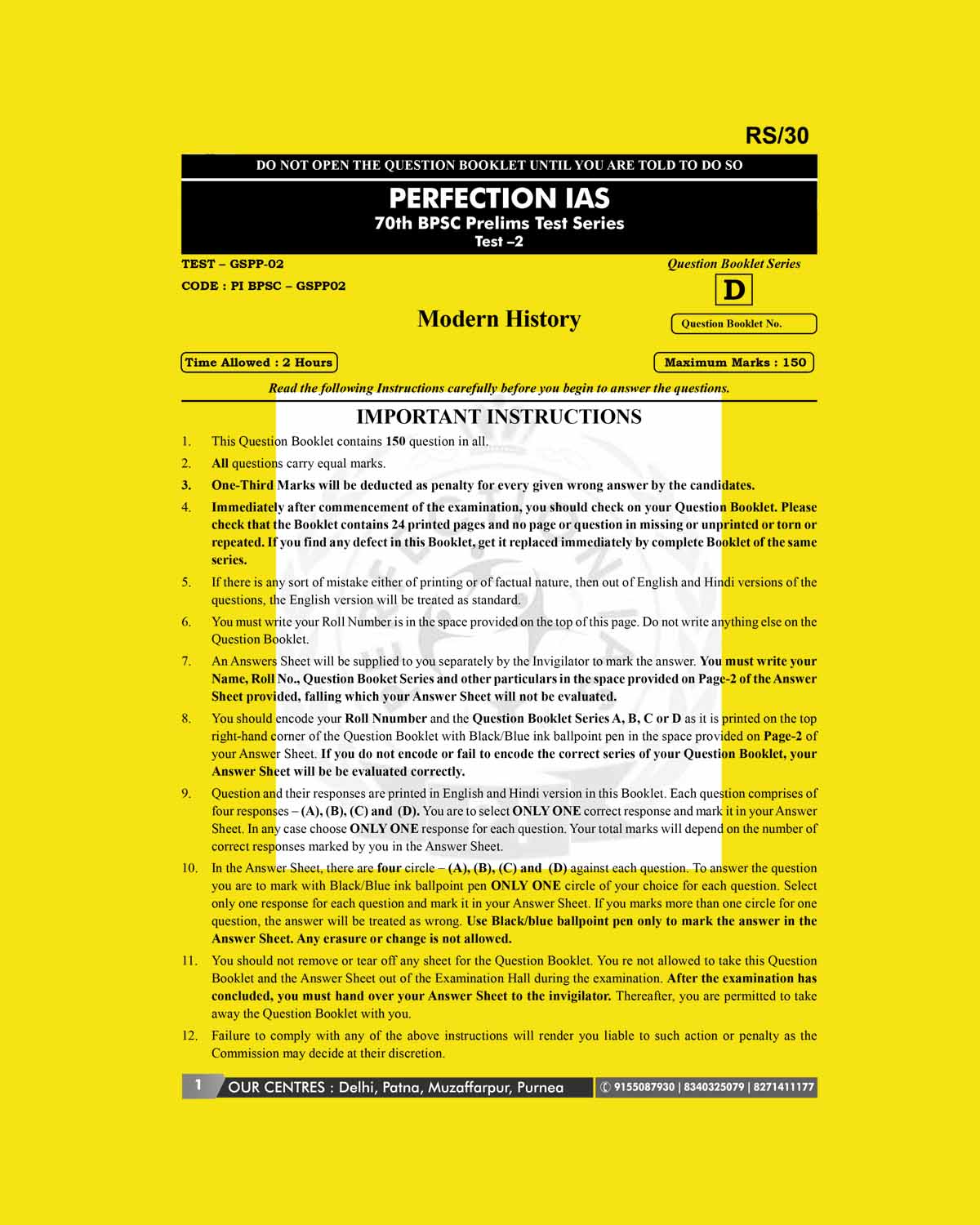 / PERFECTION IAS 70TH BPSC TEST-2 2024 FINAL (MODERN HISTORY) (ENGLISH & HINDI) {BLACK AND WHITE}