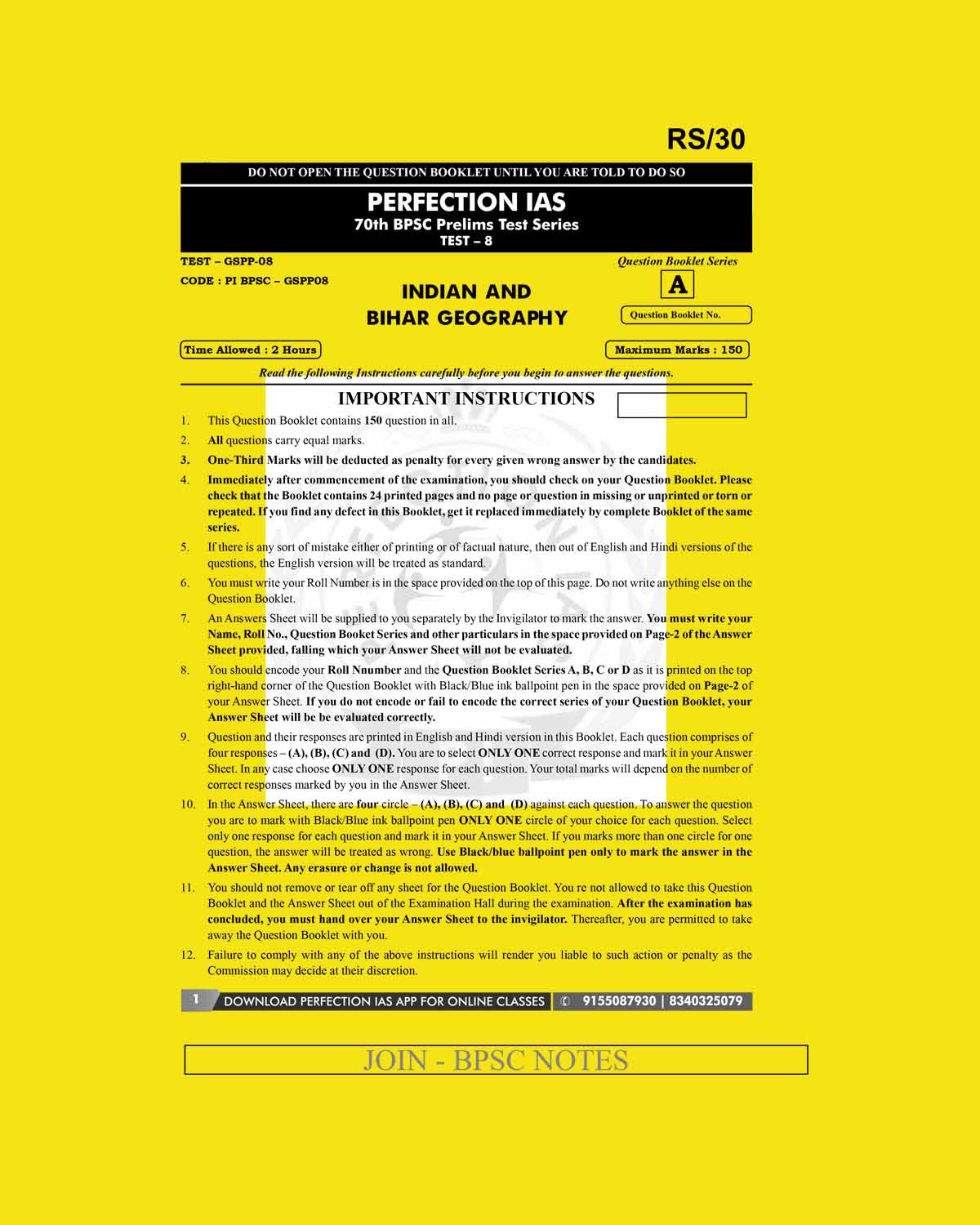 / PERFECTION IAS 70TH BPSC TEST-8 2024 FINAL (INDIAN & BIHAR GEOGRAPHY) (ENGLISH & HINDI) {BLACK AND WHITE}