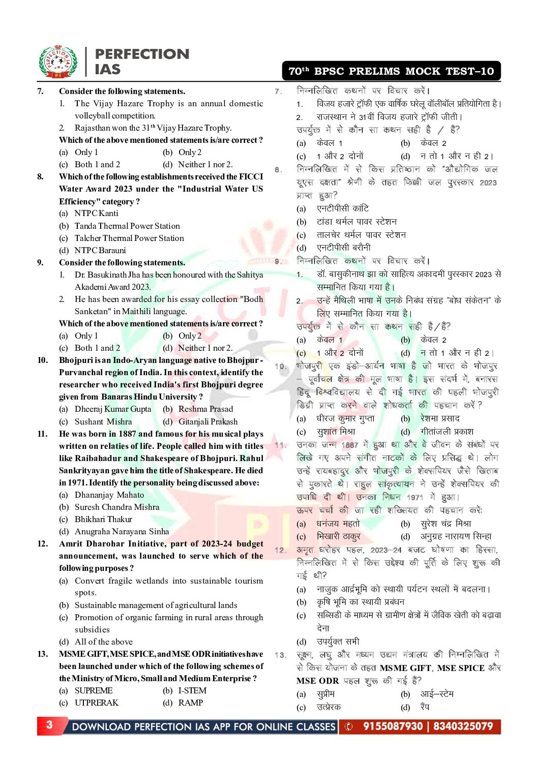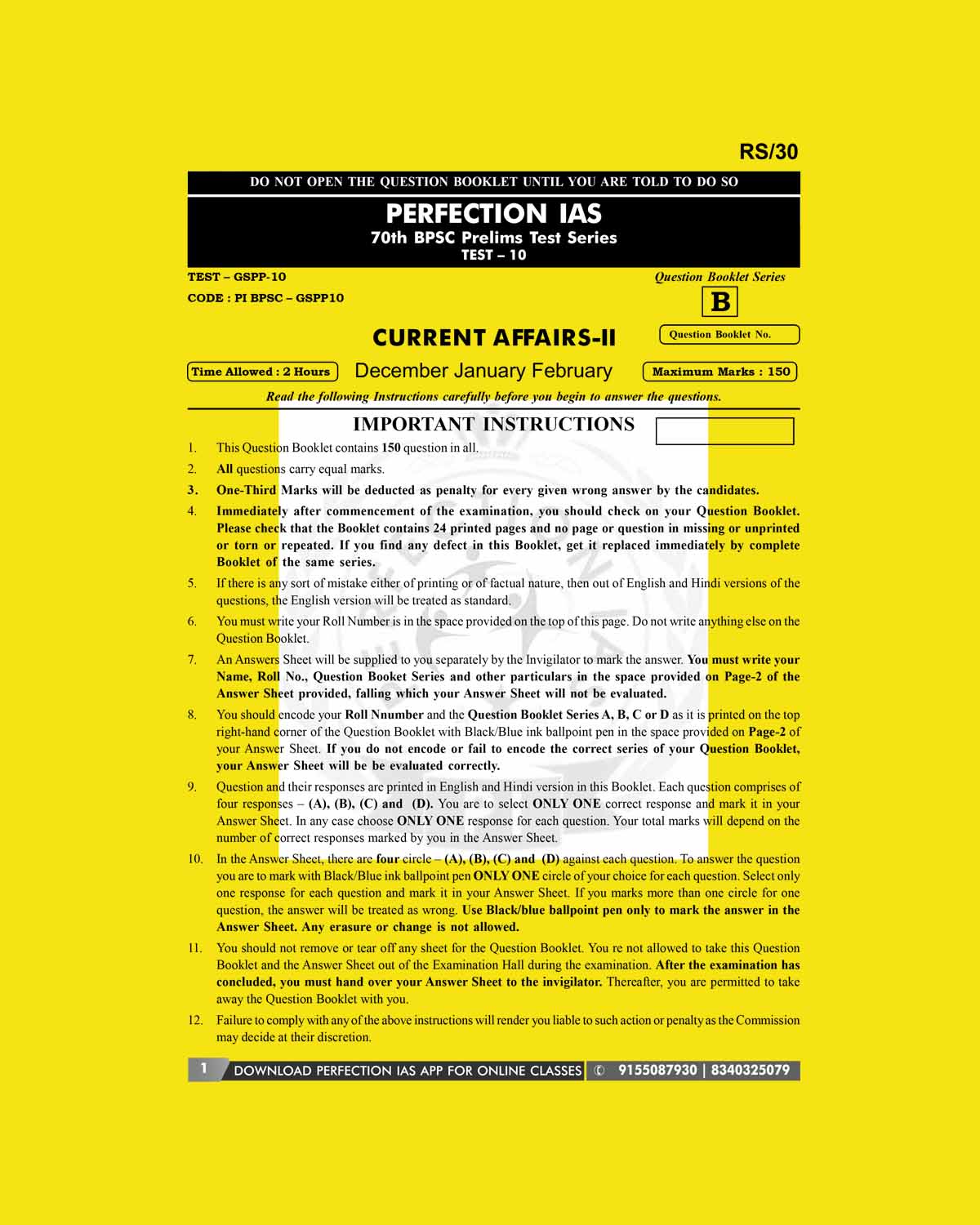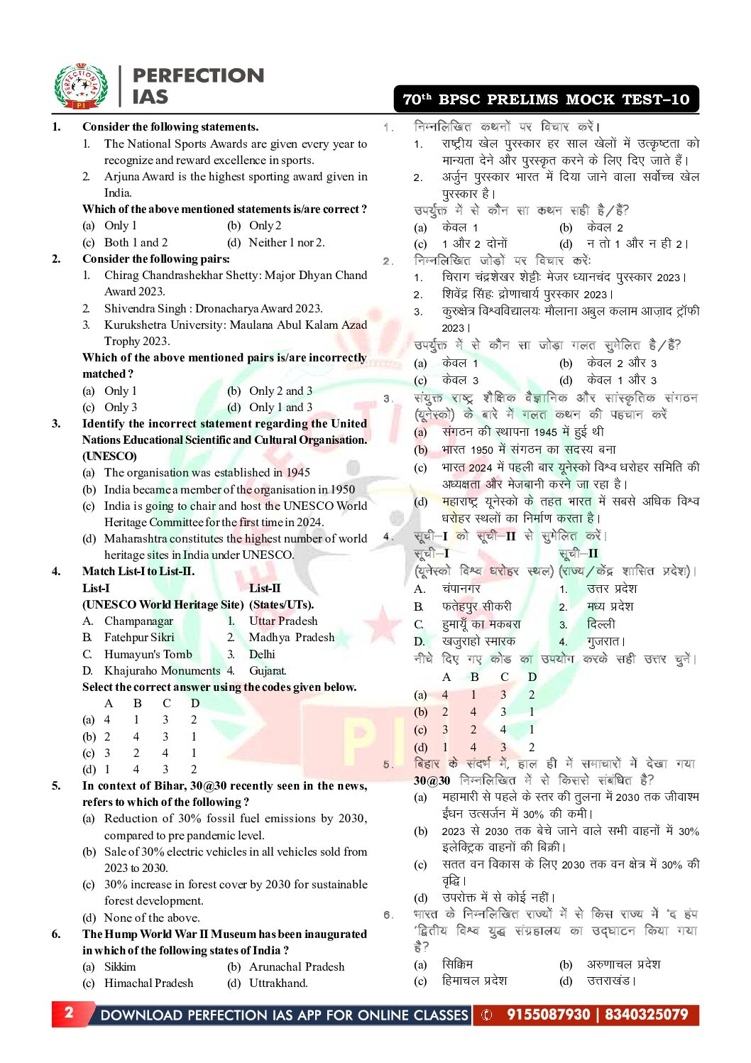 / PERFECTION IAS 70TH BPSC TEST-10 2024 FINAL (CA-2 DEC 2023 TO FEB 2024)) (ENGLISH & HINDI) {BLACK AND WHITE}
