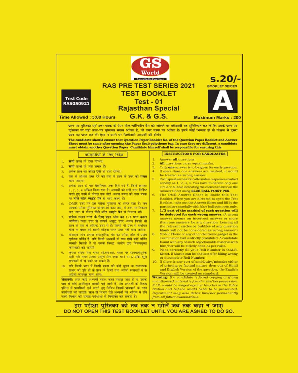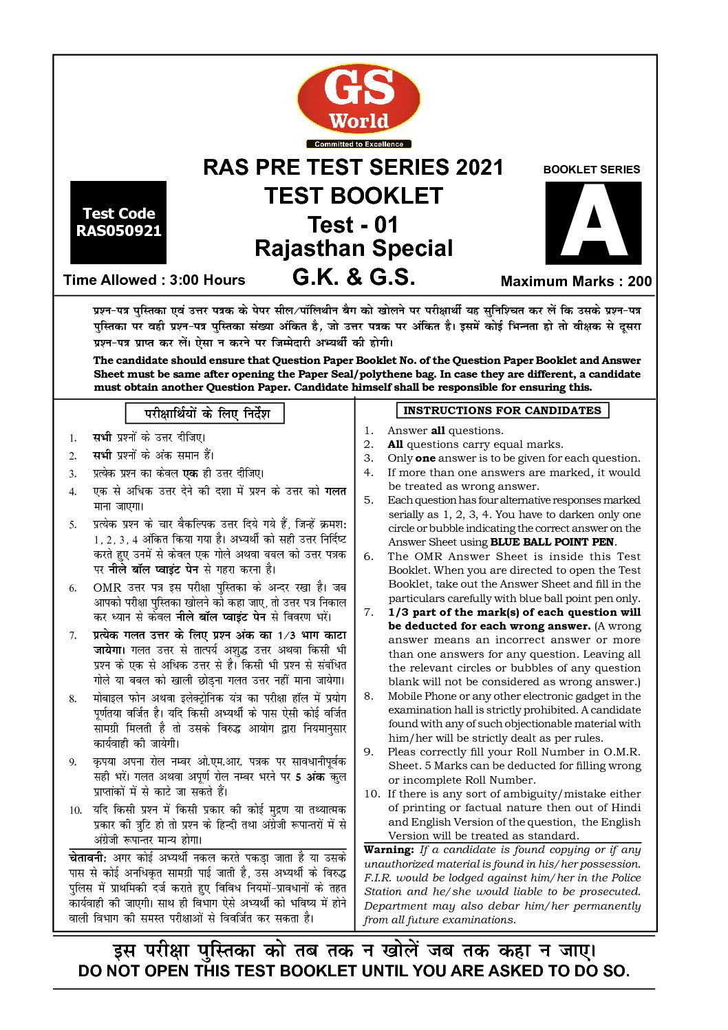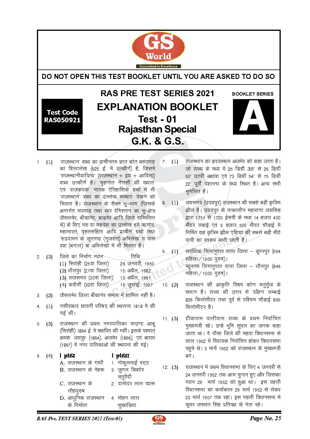 / RAJASTHAN PRELIMS TEST SERIES 2021 TEST BOOKLET G.K. & G.S. TEST – 01 ( RAJASTHAN SPECIAL )