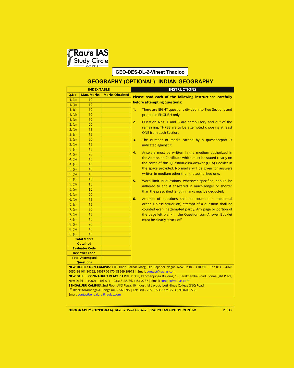 RAU’S IAS 2022 TEST- 2 GEOGRAPHY QUESTION-CUM-ANSWERS BOOKLETS (QCA) 2022 (BLACK & WHITE)