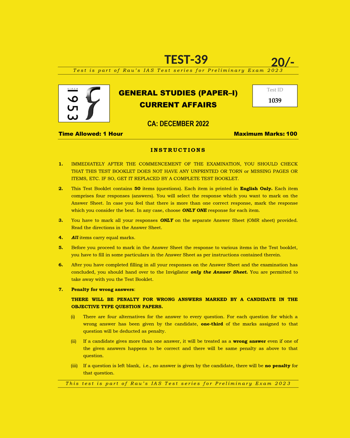 RAUS IAS 2023 TEST-39 GS (PAPER-1) CURRENT AFFAIR DECEMBER 2023 (BLACK & WHITE)
