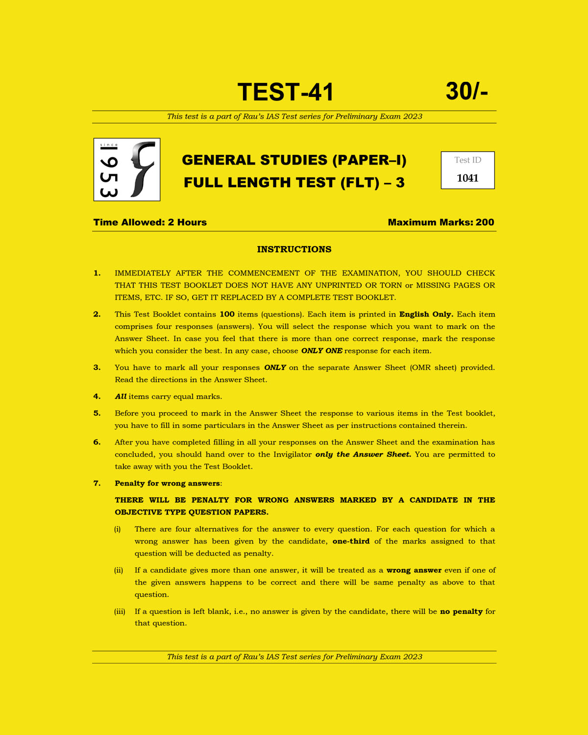 RAUS IAS 2023 TEST-41- GS (PAPER-1)FULL LENGTH TEST-3 (BLACK & WHITE)