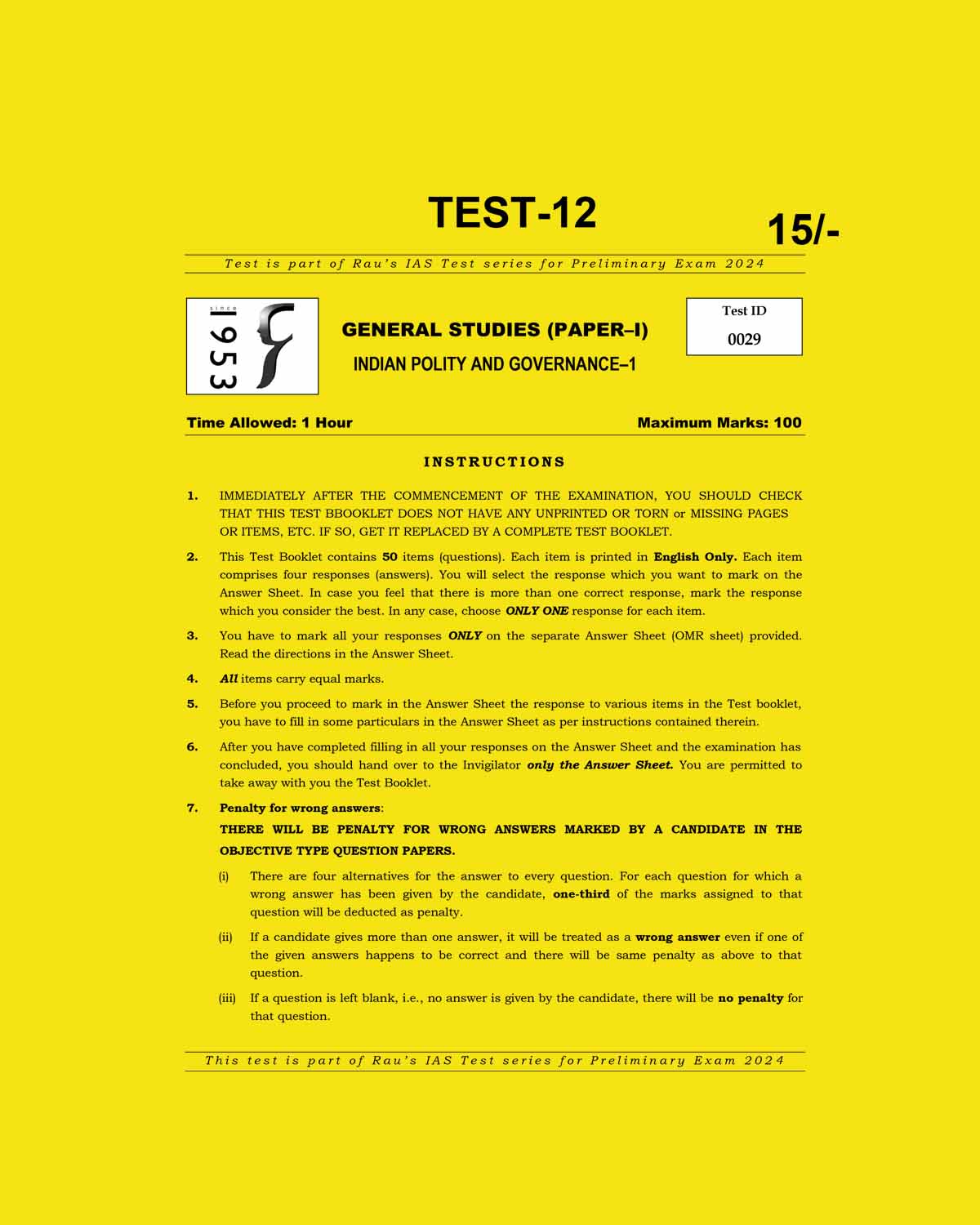 / RAU’S IAS 2024 TEST-12 (INDIAN POLITY & GOVERNANCE-I) ENGLISH MEDIUM (BLACK & WHITE)