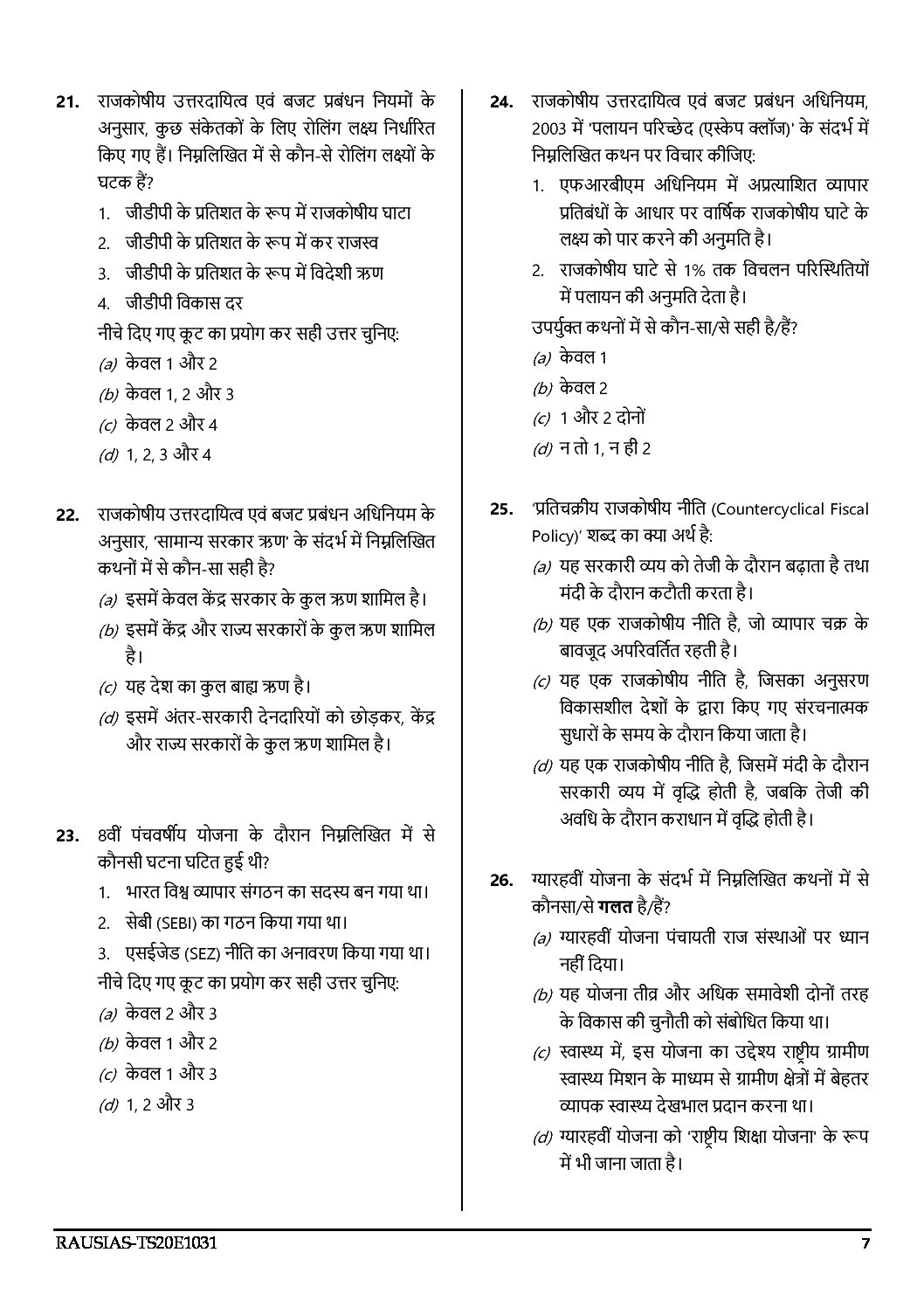 / RAU’S IAS ENGLISH & HINDI ECONOMY – 4 TOPIC TEST – 21 – PRE – 2020