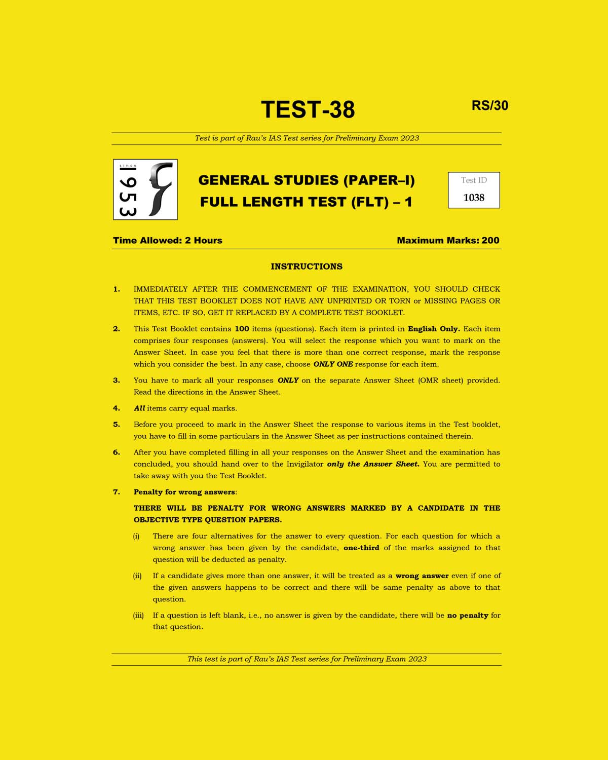 / RAUSIAS 2023 TEST-38 GS (PAPER-1) FULL LENGTH TEST-1 (BLACK & WHITE)