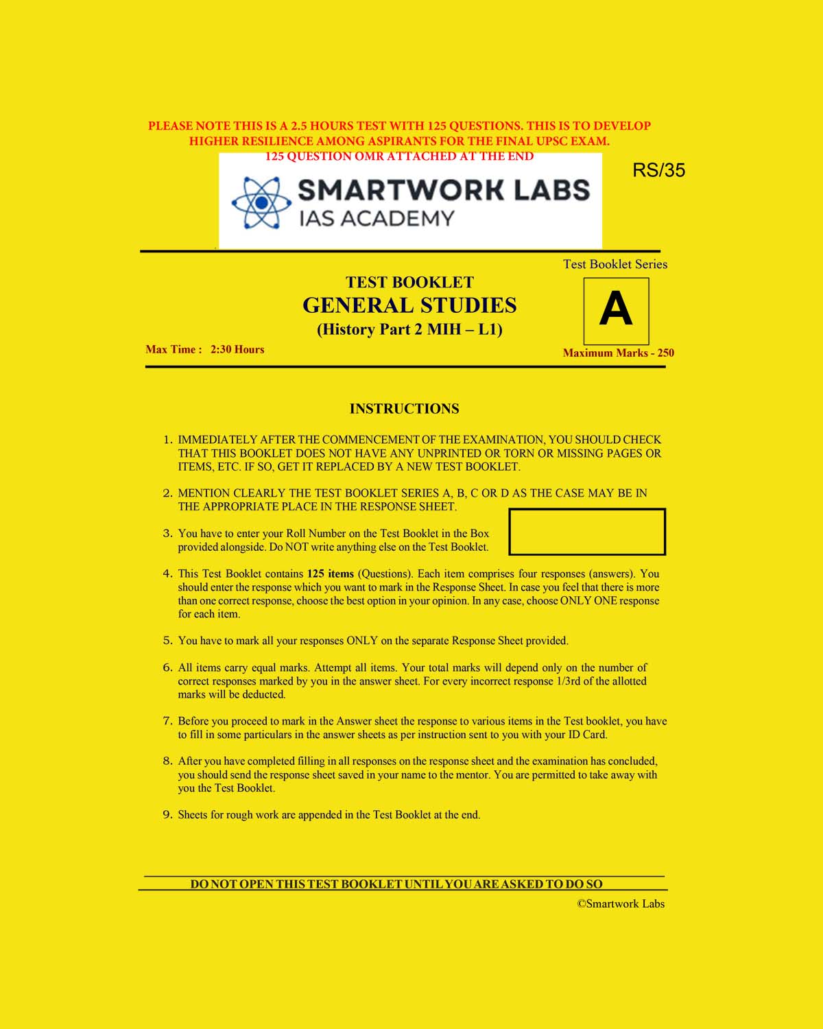 SMARTWORKS LABS IAS ACADEMY 2023 GS TEST- 8 HISTORY PART- 2 MIH -L 1- (BLACK AND WHITE) quantity