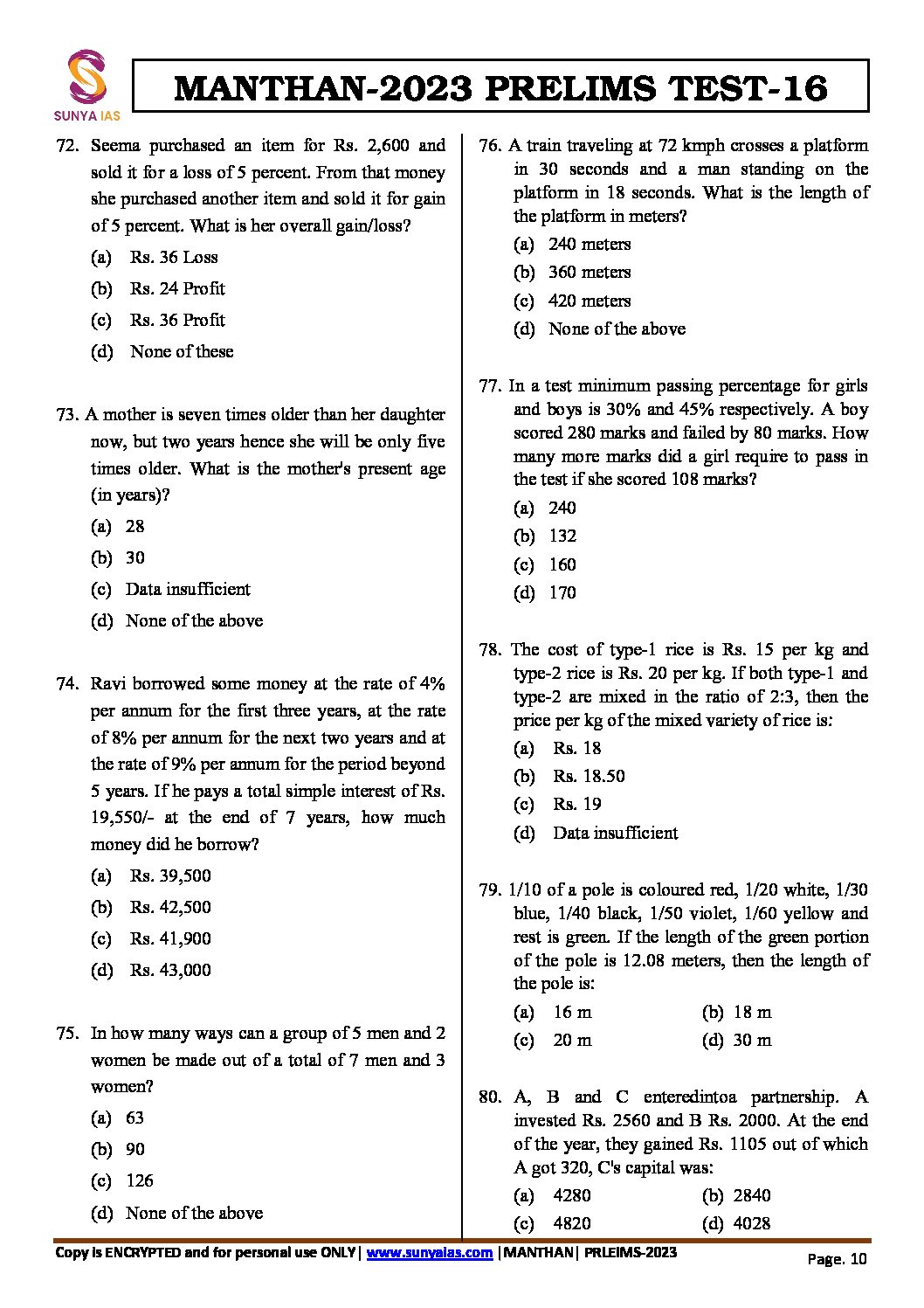SUNYA IAS 2023 PRELIMS TEST-16 MANTHAN PRELIMS 2023 TEST SERIES CSAT (PAPER-II) QUANTITATIVE APTITUDE (BASIC LEVEL) (BLACK & WHITE) quantity