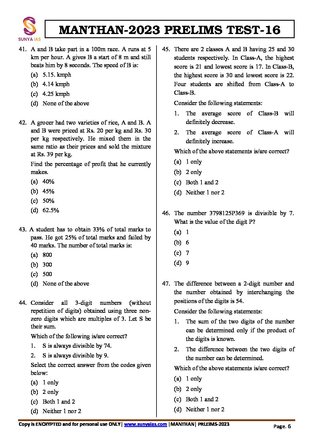 / SUNYA IAS 2023 PRELIMS TEST-16 MANTHAN PRELIMS 2023 TEST SERIES CSAT (PAPER-II) QUANTITATIVE APTITUDE (BASIC LEVEL) (BLACK & WHITE)
