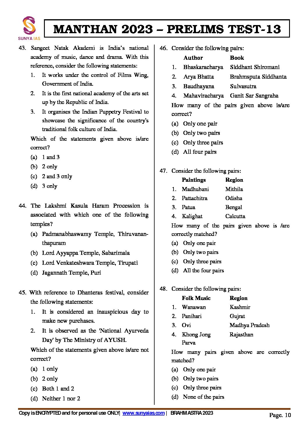 / SUNYA IAS 2023 TEST-13 MANTHAN PRELIMS 2023 TEST SERIES –ART & CULTURE (ADVANCED LEVEL) (BLACK & WHITE)