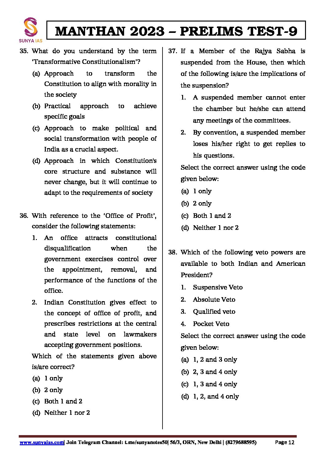 / SUNYA IAS 2023 TEST-9 MANTHAN PRELIMS 2023 TEST SERIES INDIAN POLITY & CONSTITUTION-1 (ADVANCED LEVEL) (BLACK & WHITE)