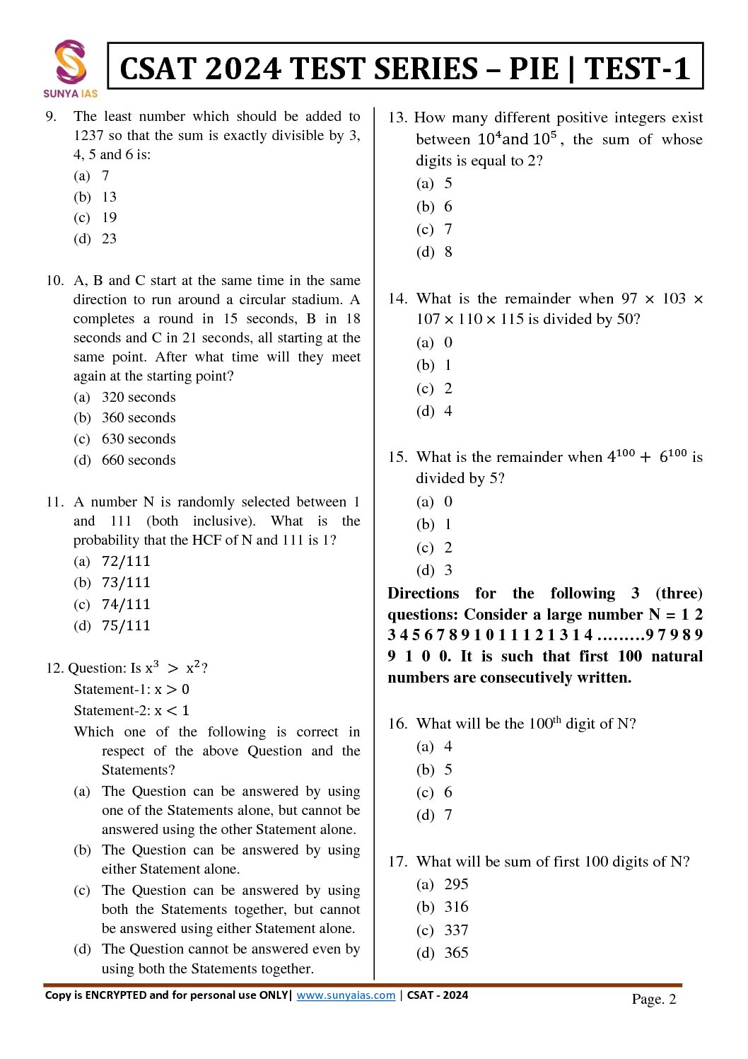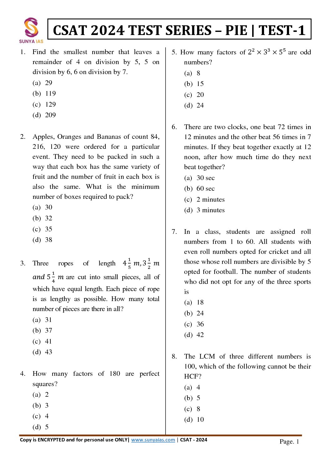 / SUNYA IAS 2024 CSAT TEST SERIES PIE PART LENGHT TEST-1 2024 FINAL {ENGLISH} {BLACK AND WHITE}