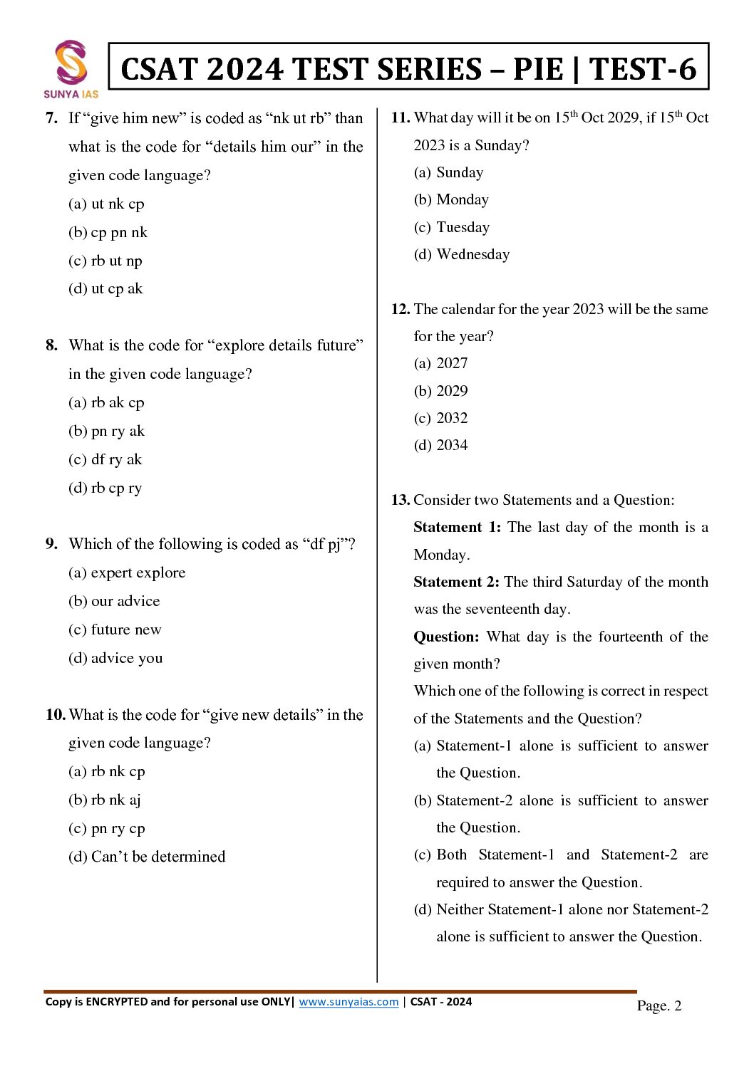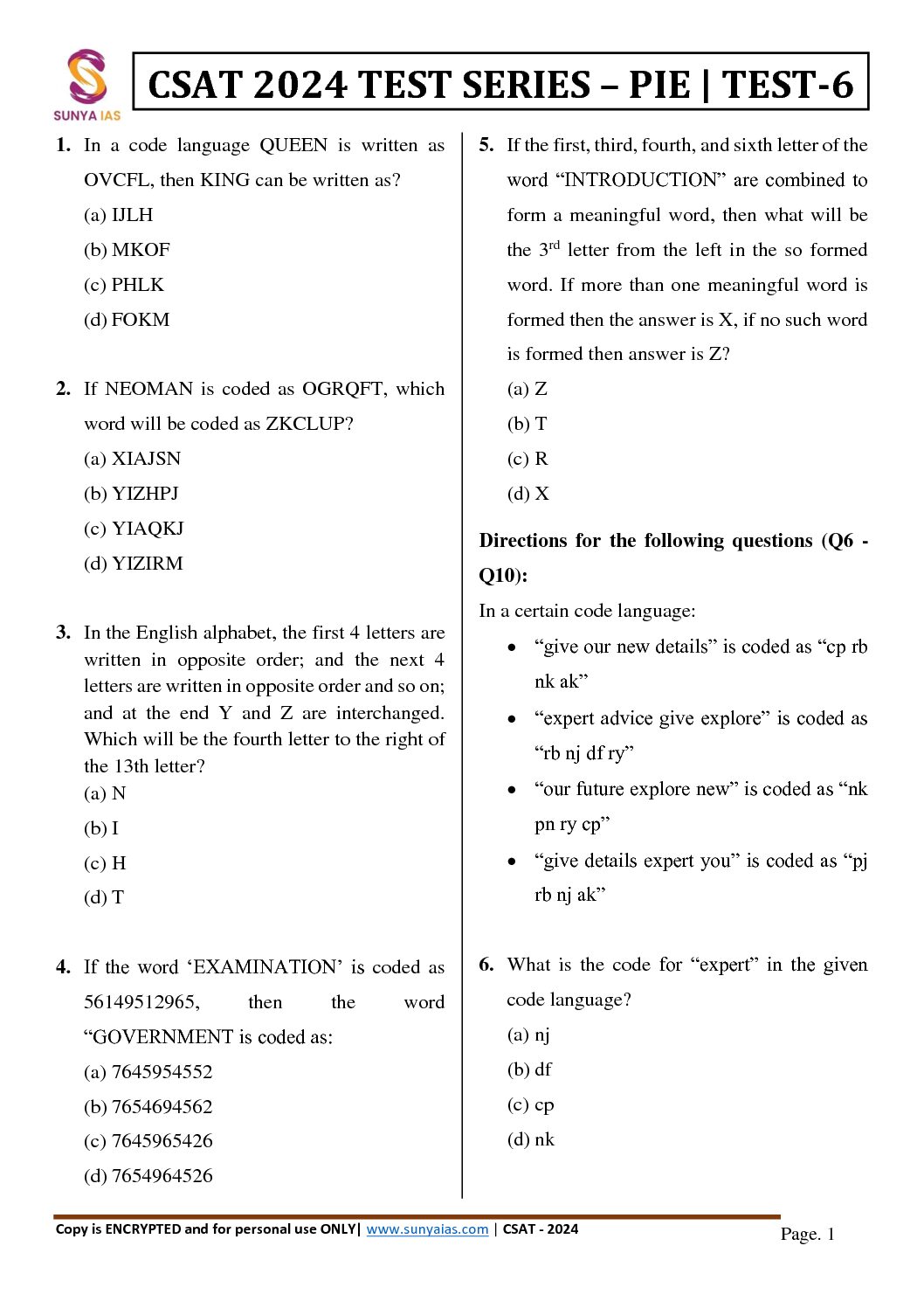/ SUNYA IAS 2024 CSAT TEST SERIES PIE PART LENGHT TEST-6 2024 FINAL {ENGLISH} {BLACK AND WHITE}
