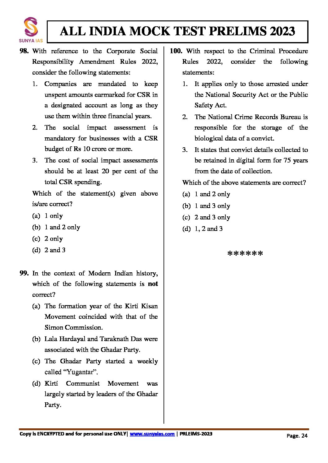 SUNYA IAS PRELIMS 2023 ALL INDIA MOCK TEST-1 (BLACK & WHITE)