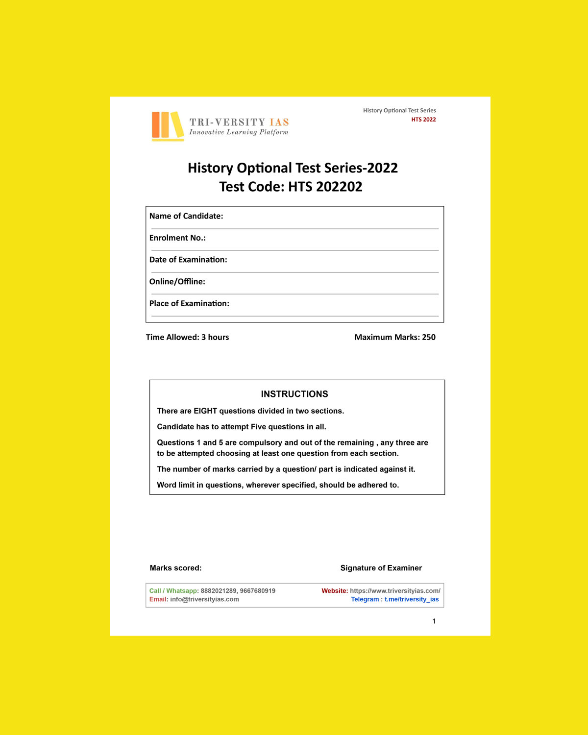 / TRI-VERSITY IAS 2022 HISTORY OPTIONAL TEST SERIES YTS 2022 QUESTION CUM ANSWERS (QCA) BOOKLETS TEST CODE-HTS 2022-02 (BLACK & WHITE)