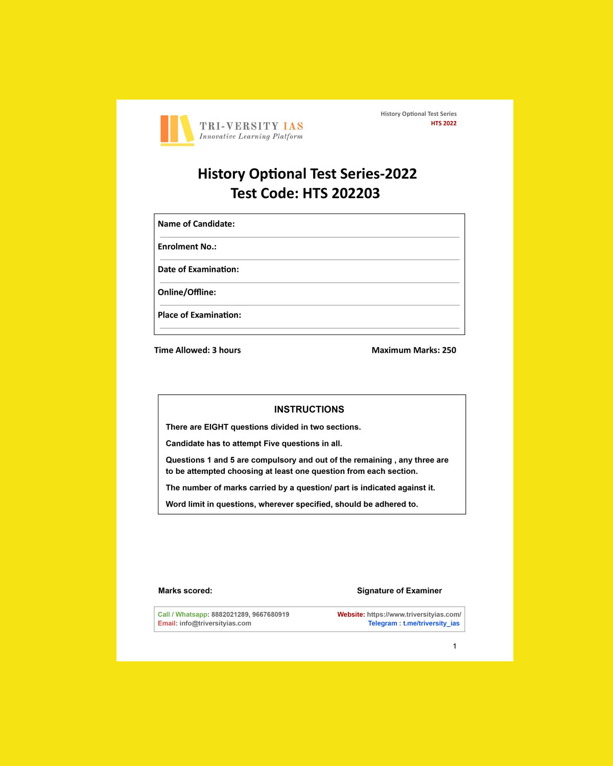 / TRI-VERSITY IAS 2022 HISTORY OPTIONAL TEST SERIES YTS-2022-QUESTION-CUM- ANSWERS (QCA) BOOKLETS TEST-CODE-HTS 2022-03 (BLACK & WHITE)