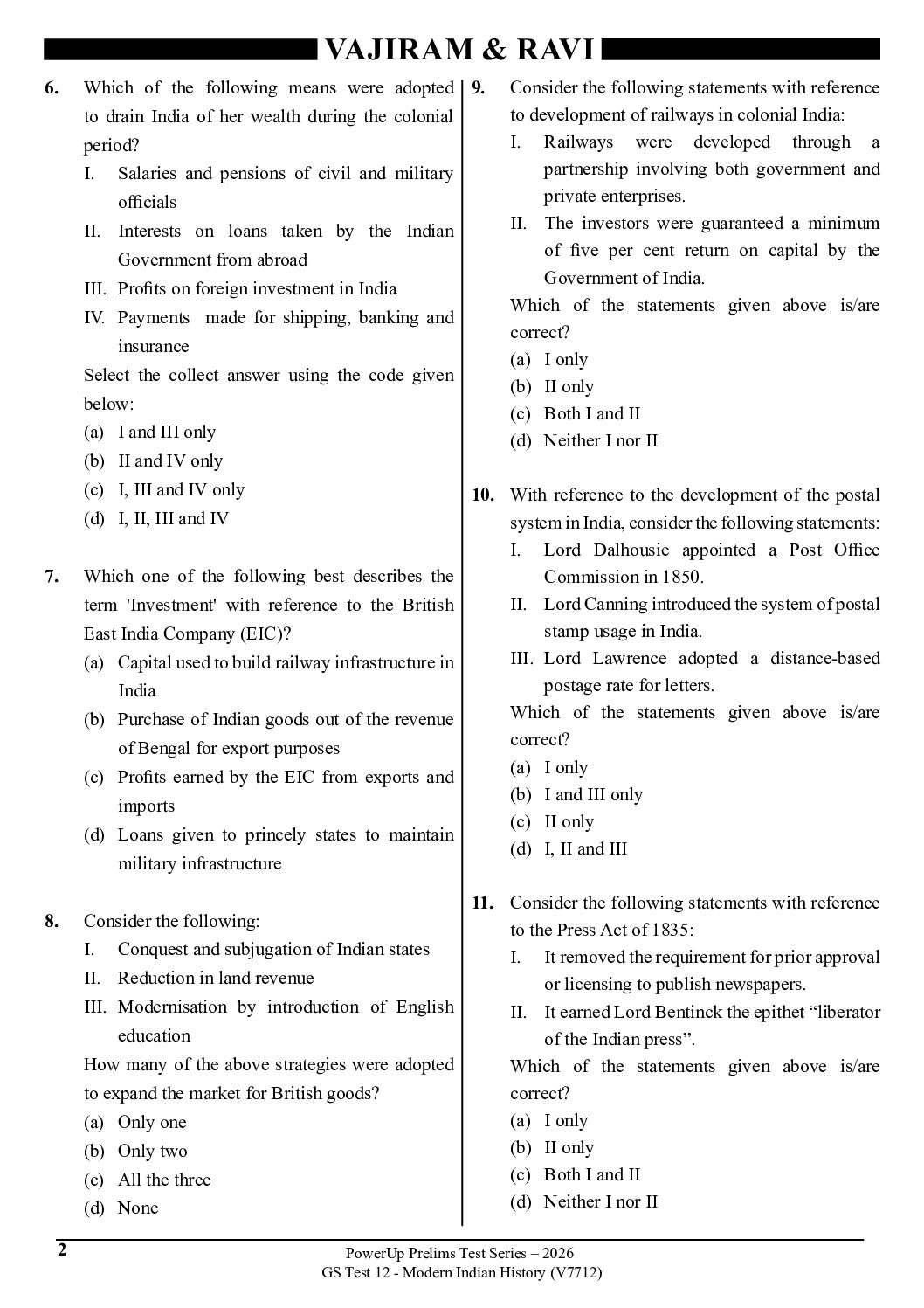 VAJIRAM & RAVI 2026 TEST-12 MODERN HISTORY (V7712) 2026 FINAL (ENGLISH) {BLACK AND WHITE}
