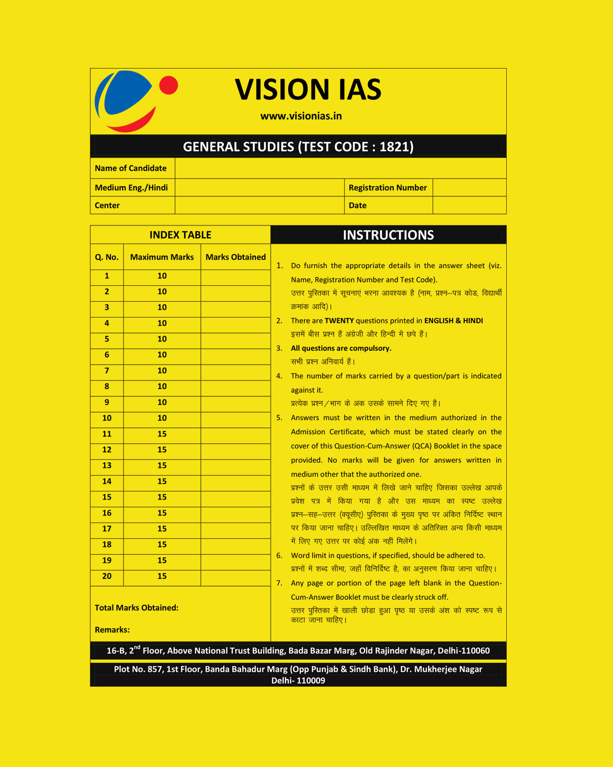 VISION IAS 2022 QCA GENERAL STUDIES TEST CODE-1821 (QUESTION CUM-ANSWER BOOKLET) 2022 (BLACK & WHITE)