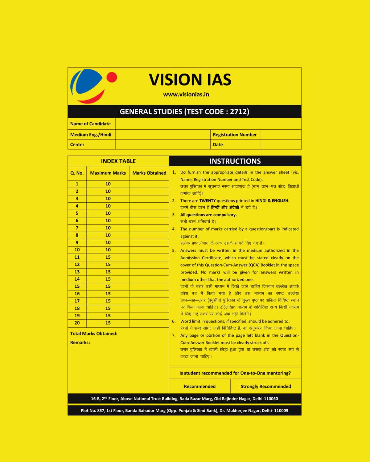VISION IAS 2025 MAINS QCA TEST-22 2712 QUESTIONS CUM ANSWERS BOOKLET 2025 FINAL (ENGLISH & HINDI) {BLACK AND WHITE} quantity