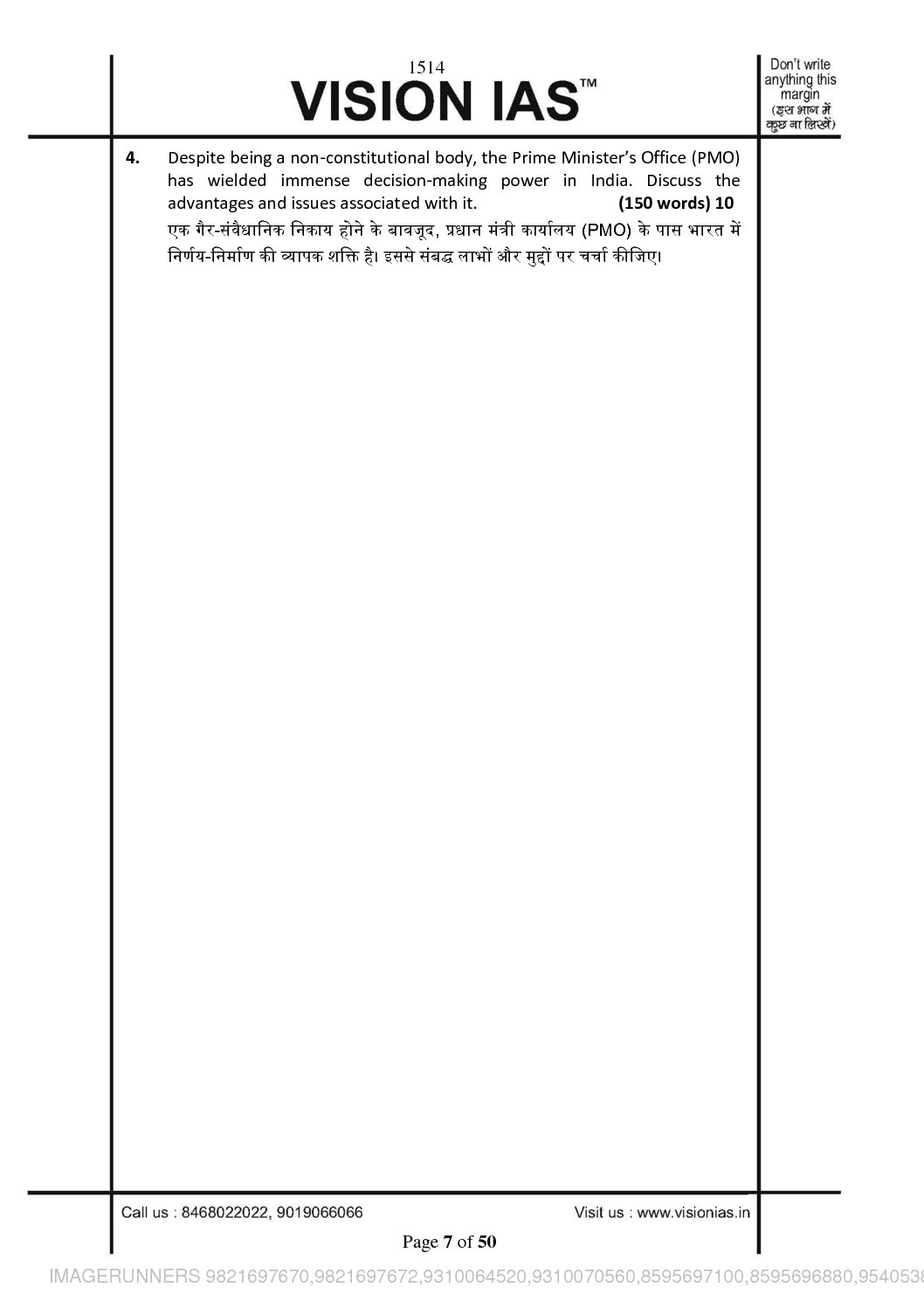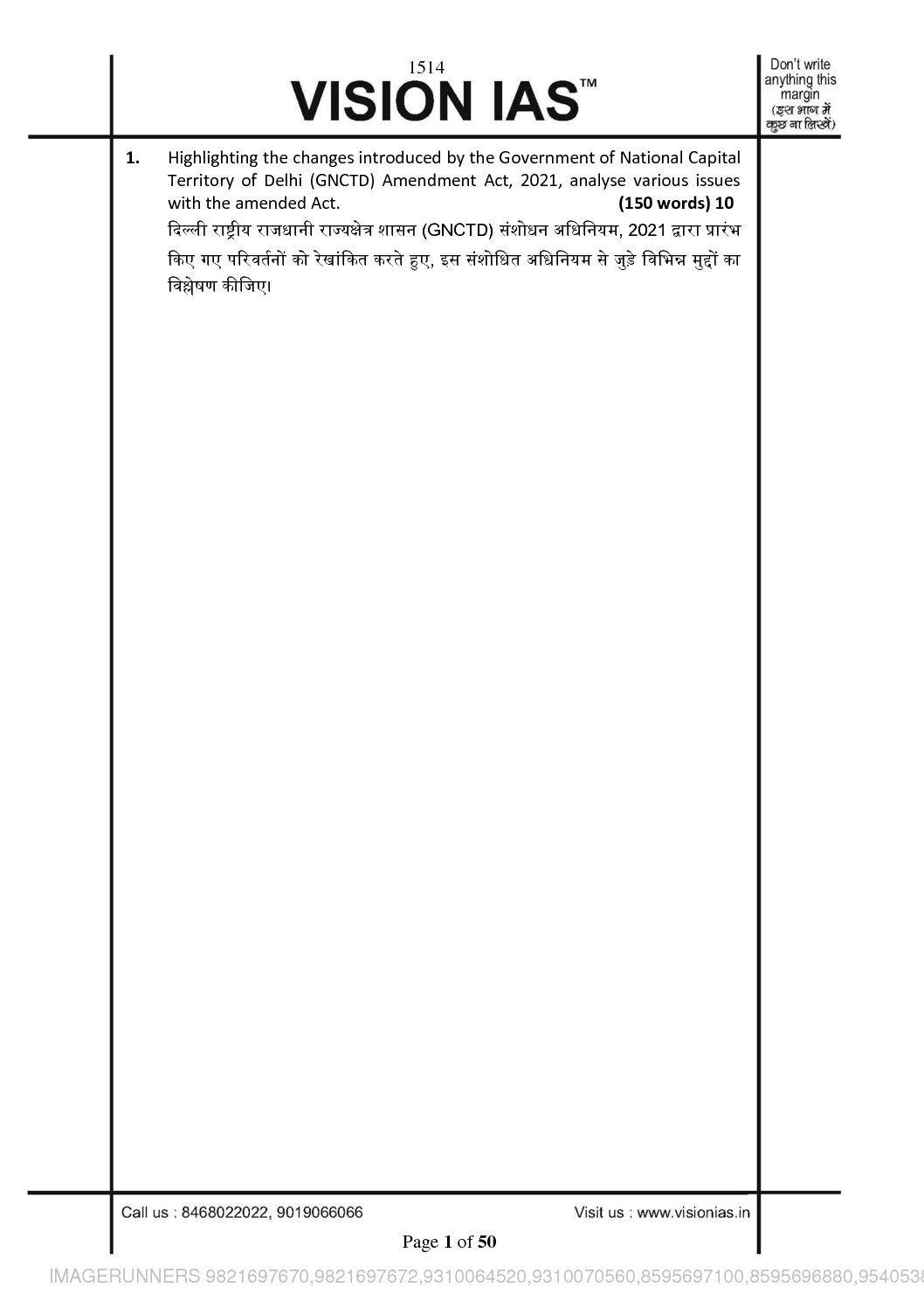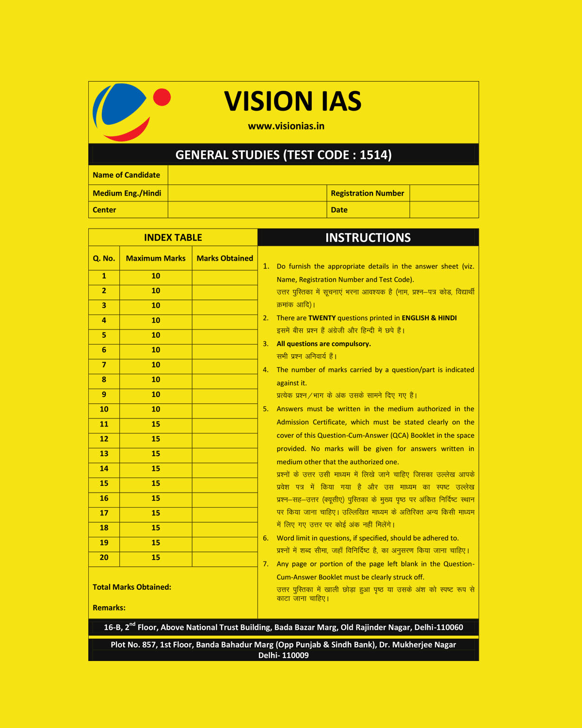 / VISION IAS GENERAL STUDIES TEST CODE-1514 (QUESTION CUM-ANSWER BOOKLET) 2021 BLACK & WHITE