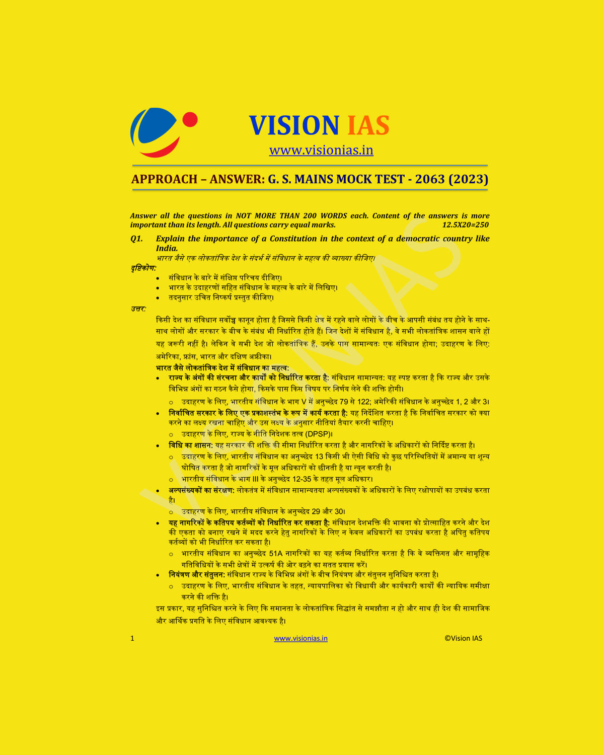 VISION IAS HINDI 2023 APPROACH ANSWER GS MAIN MOCK TEST-2063 HINDI MEDIUM (2023) MODEL PAPER (BLANK & WHITE)