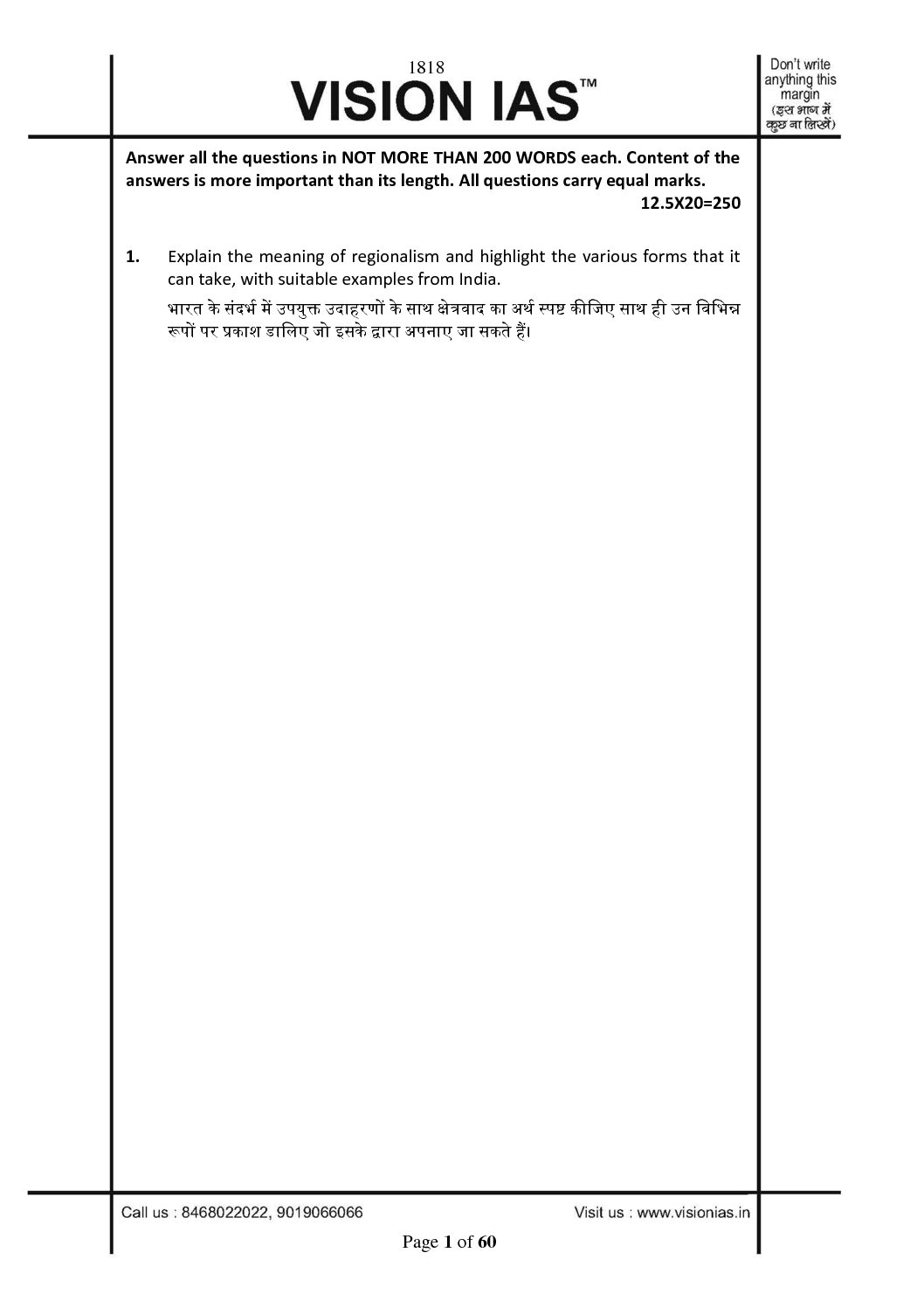 VISION IAS QCA GENERAL STUDIES TEST CODE-1818 (QUESTION CUM –ANSWER BOOKLET) 2022 (BLACK & WHITE) quantity